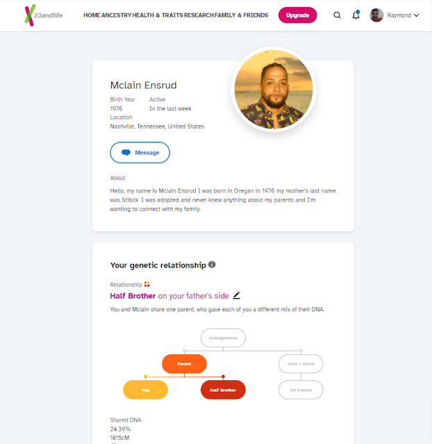 I received a message from a relative on 23andme just saying "Hey". It was from a man named Mclain in Tennessee.