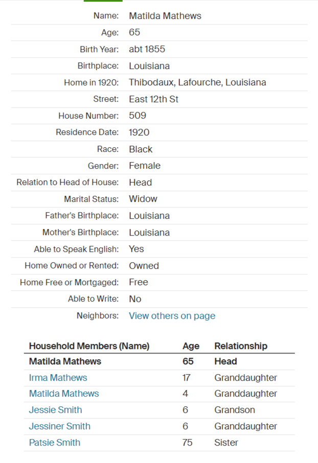 1920 Census shows 3rd Great Grandma Matilda had an older sister Patsy whose married name is Smith.