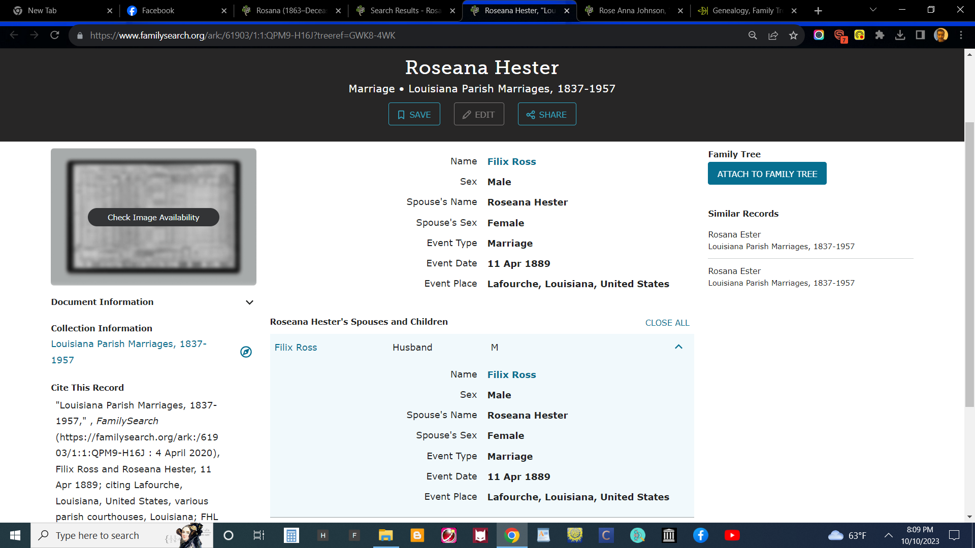I found a marriage record of Roseana Hester married to Felix Ross which revealed to me that 2nd Great Grandma Rosanna was not Rosanna Hester.