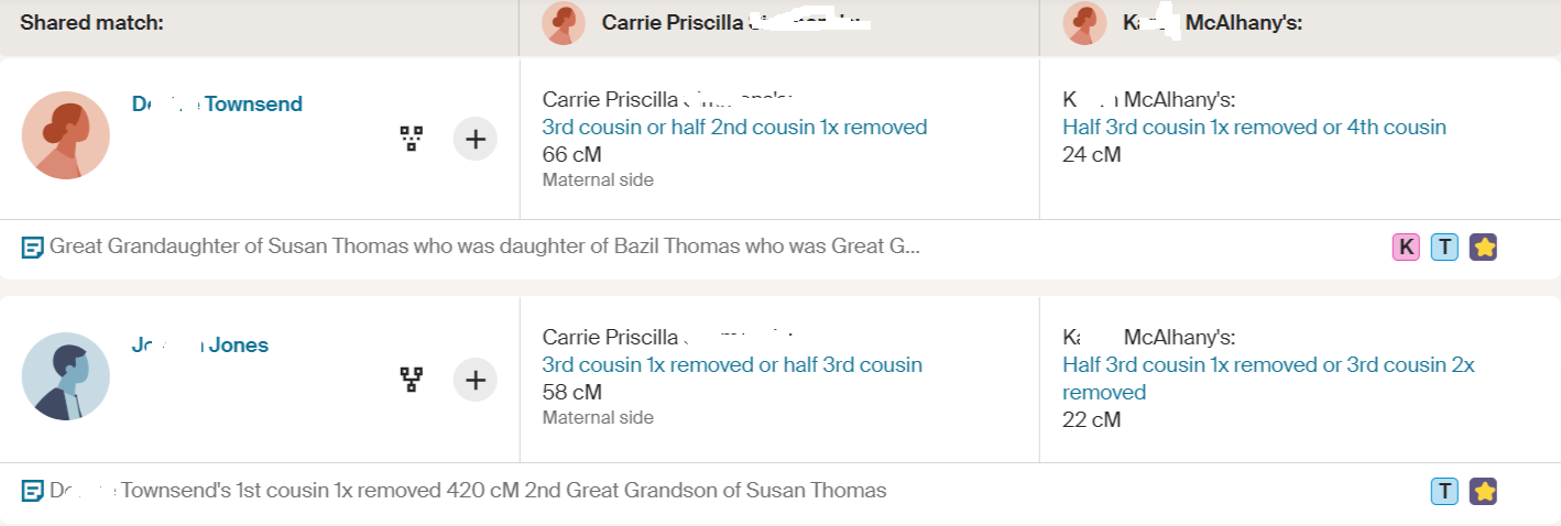 Aunt Carrie's AncestryDNA matches that are descendants of 2nd Great Grandma Mary's niece Susan Thomas are: