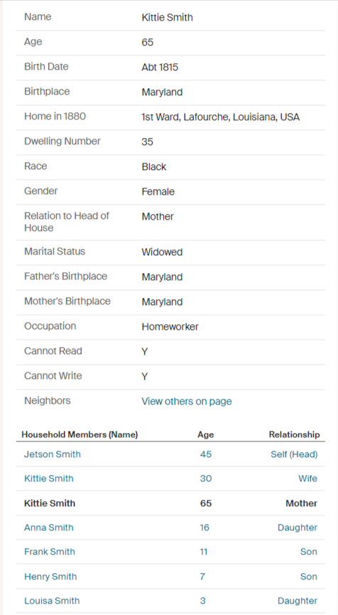 I saw that my 2nd Great Grandfather's brother Frank Daggs reported his mother's birthplace as Maryland in two Censuses. I noticed that Ambrose Anderson's household was recorded right before my 2nd Great Granduncle Frank Daggs' household in 1900 Census. I searched Ambrose Anderson, and I found that he was in household that was recorded five places after Jetson Smith's household in 1880 Census. Jetson Smith was living with wife Kitty Smith and mother Kitty Smith in Lafourche Parish, Louisiana. Jetson and his mother Kitty were recorded as being born in Maryland.